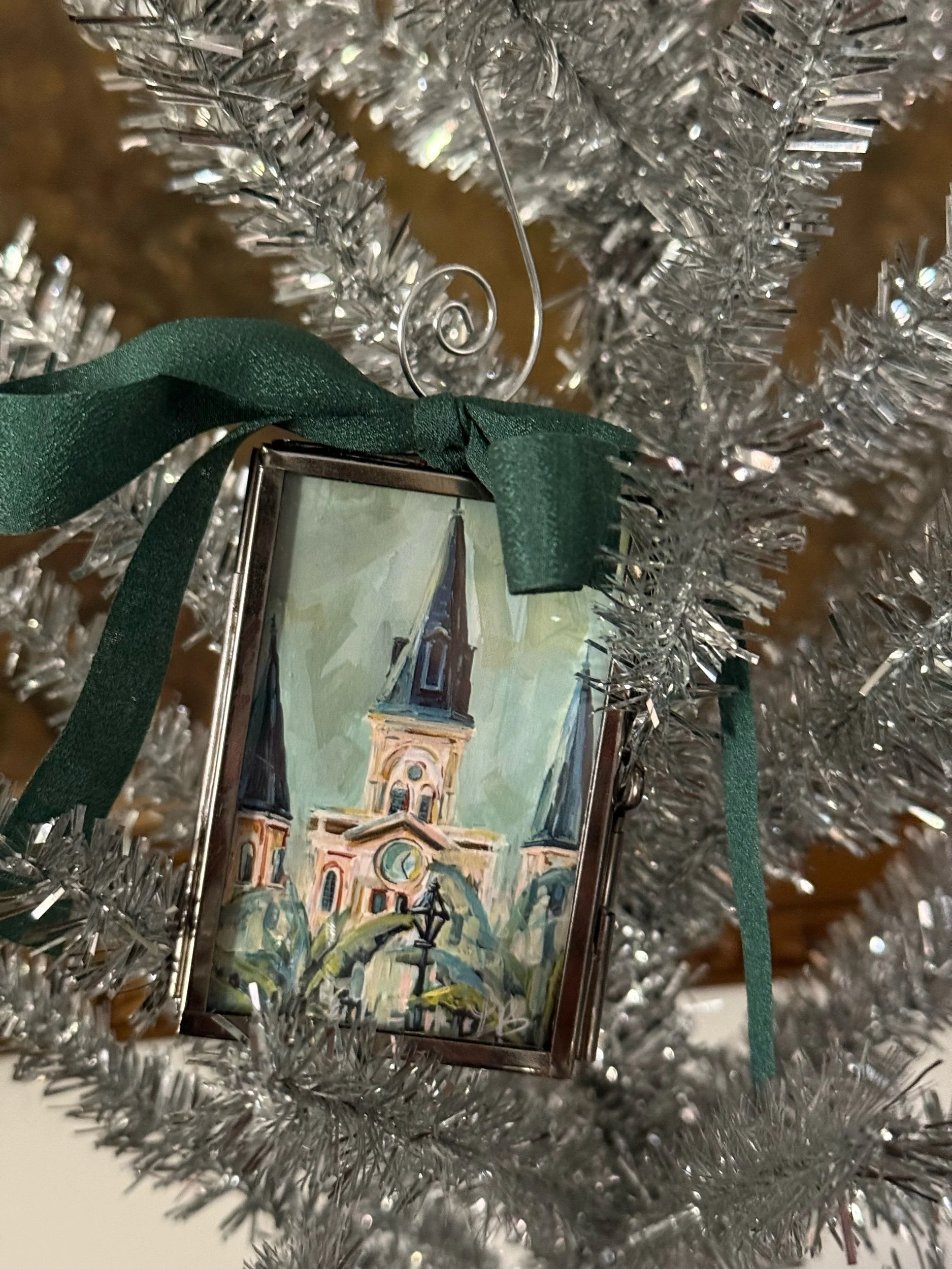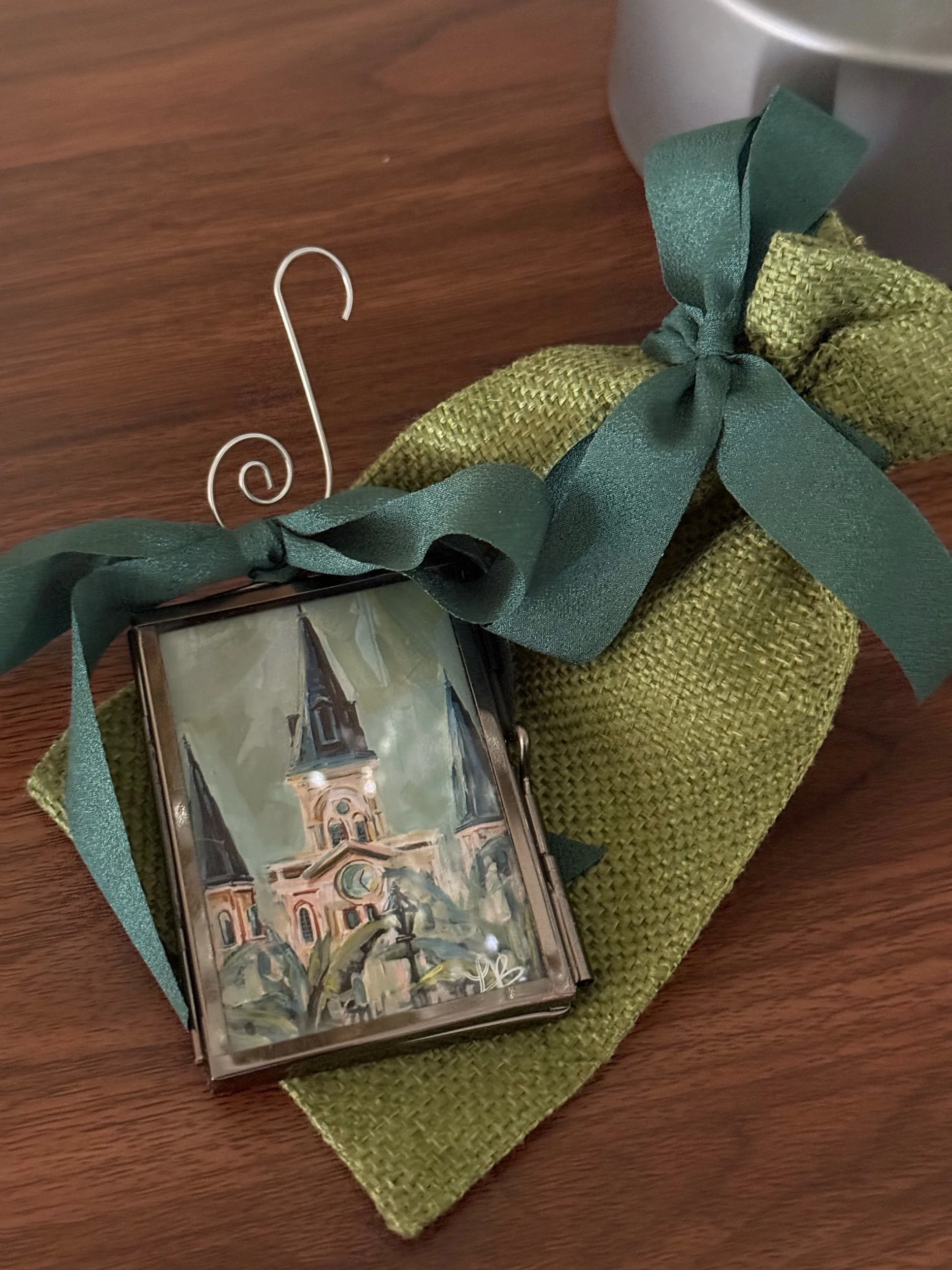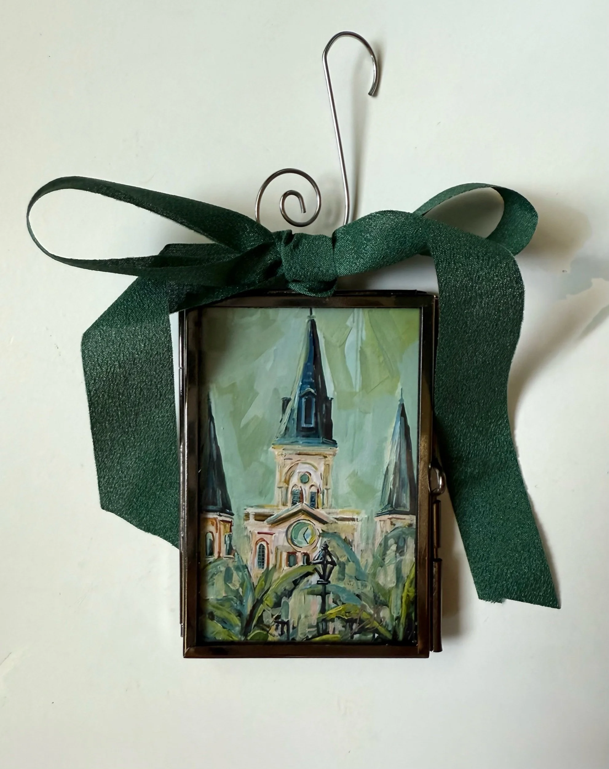 Bring a little New Orleans magic to your tree with this St. Louis Cathedral ornament — featuring a signed fine art print of my original painting in a gun metal colored, antique-style glass frame. Each piece captures the charm and color of the French Quarter in expressive, painterly brushstrokes.