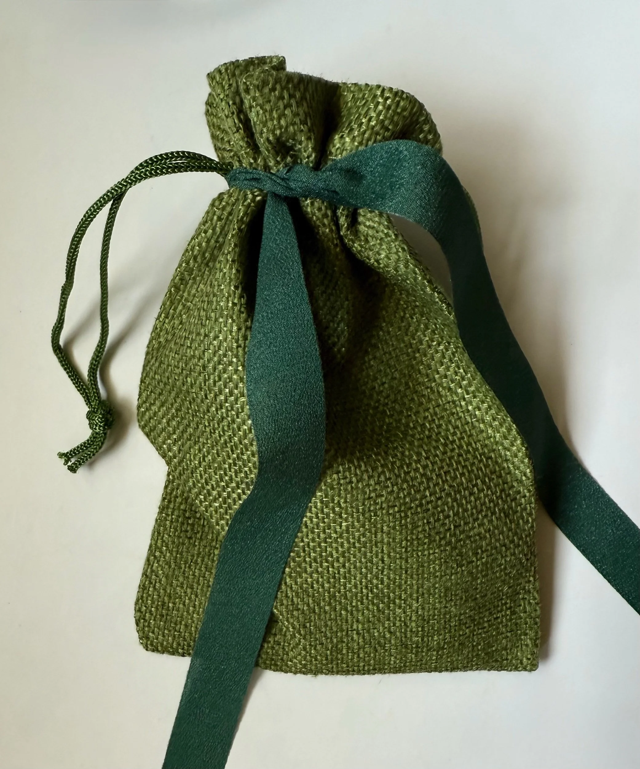 • Packaging: Comes ready for gifting in a textured green drawstring bag, tied with matching ribbon